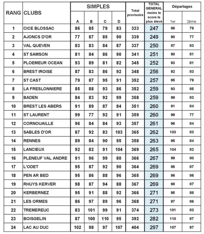 L’équipe de Cicé Blossac emporte le championnat avec un total de 247 pts (3 meilleurs cartes sur 4). L’équipe des Ajoncs d’Or monte sur la deuxième marche du podium avec 249 points. Elle devance d’un point l’équipe de Val Queven.